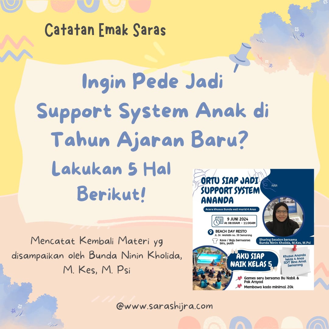 Buruan lanjut kepoin materi Bunda Ninin yang ditulis ulang versi emak saras ini : Ingin Pede Jadi Support System Anak di Tahun Ajaran Baru? Lakukan 5 Hal Berikut !
